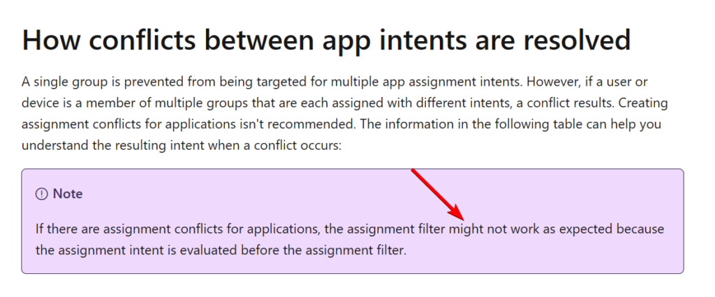 Update as of 29.01.2026: Someone recently pointed out an odd case to me. This scenario sounds somewhat rare, but not impossible. In this case, a driver management tool was deployed, and some devices received the tool as available, while Lenovo devices were supposed to receive it as required. Group 2 was somewhat imprecise, though, so some devices were in both groups. According to Microsoft, the intent is evaluated before the assignment filter. In the case below, the filter would show as “not evaluated,” making the software unexpectedly required for devices that are in both group 1 and group 2.